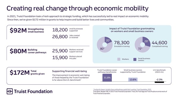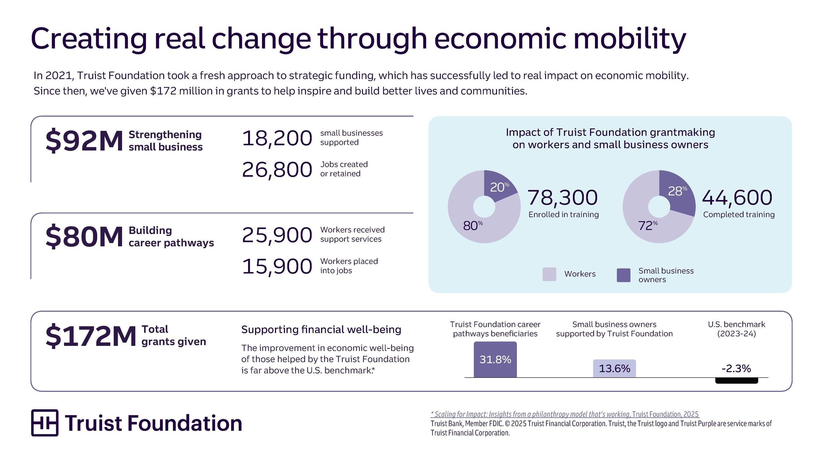"At a time when many nonprofits are seeing reduced giving, we've stayed the course—partnering deeply with nonprofits, learning from our grant partners and doubling down on what works," said Lynette Bell, president of Truist Foundation. "Economic mobility is not just an aspiration; it's a measurable outcome when we invest in people, in organizations, and in ecosystems. This report reflects Truist Foundation's commitment to leading with purpose and delivering on our promise to drive impact."